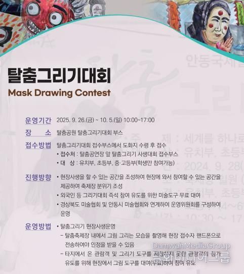 안동시는 “세계탈춤그리기대회는 어린이와 청소년이 축제를 함께 만들어 가는 주인공이 되는 기회”라며 “아이들의 창의적인 시선 속에서 탈춤의 새로운 가치를 발견할 수 있을 것”이라고 밝혔다.