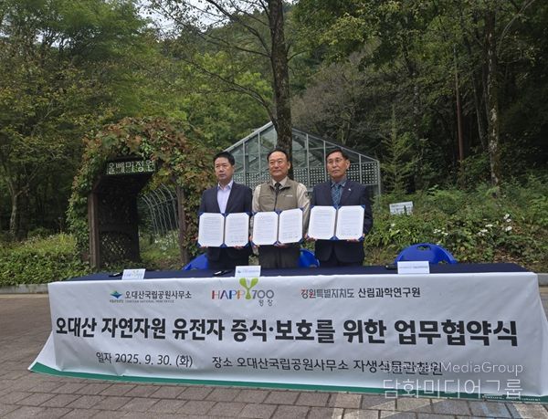 시민행정신문 강갑수 기자 | 강원특별자치도 산림과학연구원은 9월 30일 국립공원공단 오대산국립공원사무소, 평창군과 우수 산림 유전자원 보존을 위한 업무협약을 체결하고, 오대산국립공원 내 보호수로 지정된 잎갈나무의 후계목을 육성하고 있다고 밝혔다.