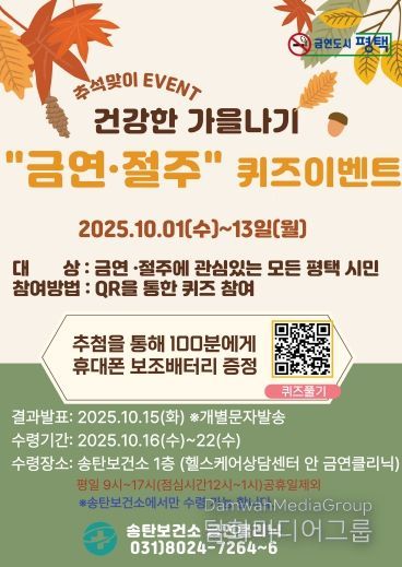 시민행정신문 기자 | 평택시 송탄보건소에서 오는 10월 1일부터 13일까지 시민 누구나 참여할 수 있는 ‘건강한 가을나기 금연·절주 퀴즈 이벤트’를 진행한다.