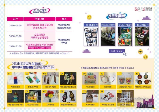체험 부스에서는 ▲백제 청사초롱 만들기 ▲한복 나비 똑딱 핀 만들기 ▲나전 원목 책갈피 ▲우드 방문걸이 꾸미기 ▲비즈 머리띠 ▲백제금동대향로 열쇠고리 만들기 등 총 15종의 체험 프로그램이 운영되며, 남녀노소 누구나 무료로 참여할 수 있다.