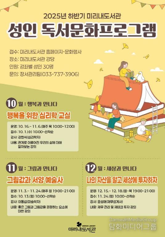 시민행정신문 강갑수 기자 | 원주시 미리내도서관은 지역 시민들의 문화적 접근성을 높이기 위해 성인을 대상으로 하반기 독서문화프로그램을 운영한다.