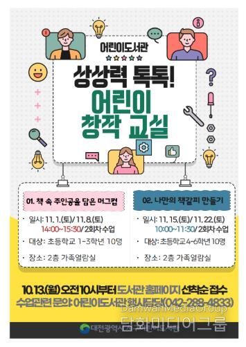 시민행정신문 강갑수 기자 | 대전 서구 어린이도서관은 관내 초등학교 아동을 대상으로 ‘상상력 톡톡! 어린이 창작교실’을 운영한다고 1일 전했다.