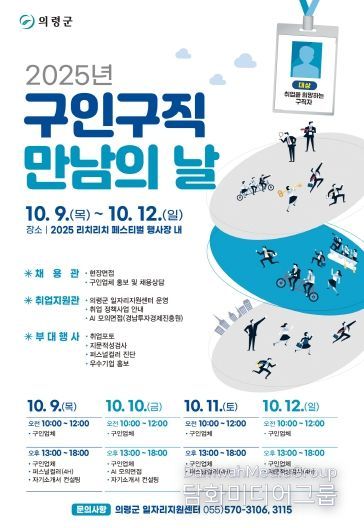시민행정신문 강갑수 기자 | 의령군은 내달 9일부터 12일까지 나흘간 진행되는 제4회 리치리치 페스티벌기간 내 ‘2025 구인·구직 만남의 날’을 개최한다고 1일 밝혔다.
