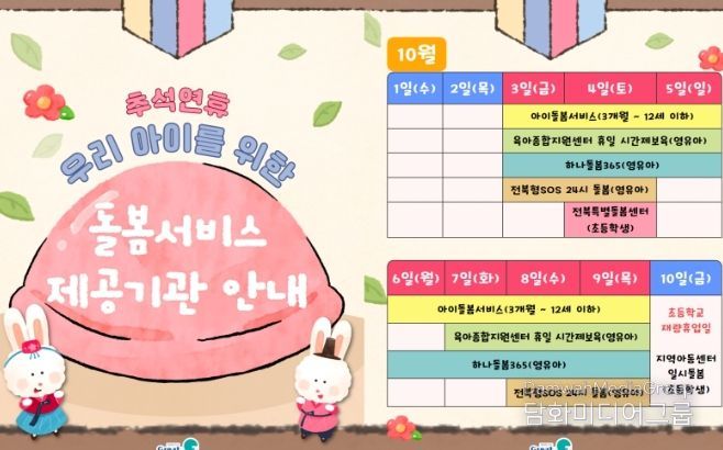 여기에 더해 익산 딩동댕어린이집은 3~4일과 8~9일 동안 전북형 SOS 돌봄센터를 운영하고, 익산어린이집은 하나돌봄 365 사업을 통해 연휴 전 기간 휴일돌봄 서비스를 제공한다.