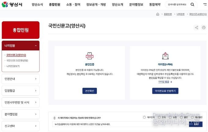 시는 국민신문고 시스템 정상화가 4주 이상 소요됨에 따라 정부의 시스템 정상화가 이뤄질 때까지 양산시 홈페이지에 마련된 ‘국민신문고(양산시)’에서 접수한다.
