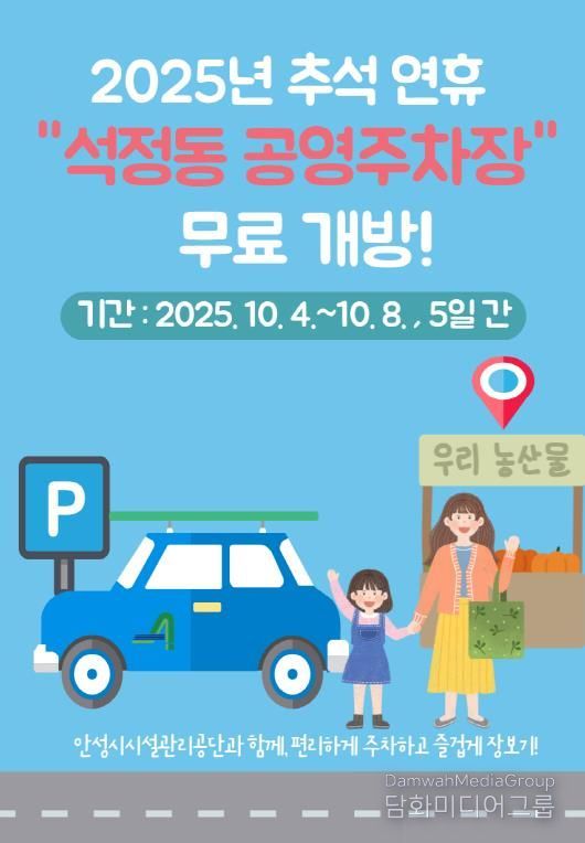 무료 개방 기간은 10월 4일부터 10월 8일까지 5일 간이며 석정동 공영주차장은 안성시 전통시장 주변 상권과 인접해 있고 주차수요가 집중되는 시설로, 무료 개방을 통해 명절 장보기와 지역 상권 활성화에 큰 도움이 될 것으로 기대된다.