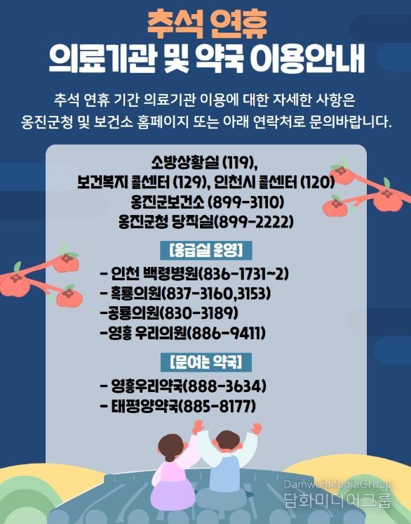 연휴 중 문을 여는 병·의원과 약국 정보는 국번 없이 ▲129(보건복지콜센터), ▲119(구급상황관리센터), ▲응급의료포털, ▲스마트폰 애플리케이션 ‘응급의료정보제공’ 및 ‘응급똑똑’, ▲옹진군청(옹진군보건소) 홈페이지에서 확인할 수 있다.