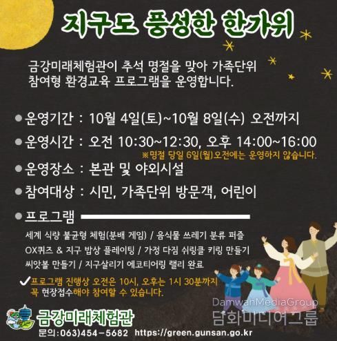 금강미래체험관은 오는 4일부터 8일까지 닷새간 본관과 야외시설 일대에서 ‘지구도 풍성한 한가위’를 주제로 한 특별 프로그램을 운영한다.