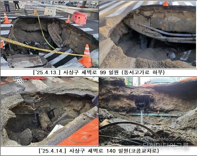 지난 6개월간 17차 회의를 통해 모든 상황을 긴밀히 공유하고, 추가 땅꺼짐 사고를 막기 위해 ▲새벽로 일원 지표투과레이더(GPR) 집중탐사(월 2회 이상) ▲감전1중천 하수박스 보수·보강 ▲상수도관 원격 누수감시(상시, 56곳) ▲지하수위 계측 강화(61곳, 주 2회 분석→108곳, 주 3회 분석) ▲지반침하위험도평가 ▲새벽로 일원 노후 하수시설(측구) 정비 등 다각적인 노력을 기울이고 있다.