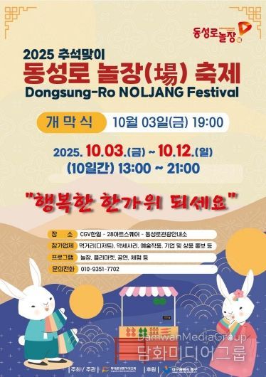 시민행정신문 기자 | 대구 중구는 10월 3일부터 12일까지 10일간 동성로 보행자전용도로 일원에서 ‘동성로에서 놀며 장보자!’라는 테마로 ‘2025 추석맞이 동성로 놀장(場) 축제’를 개최한다.
