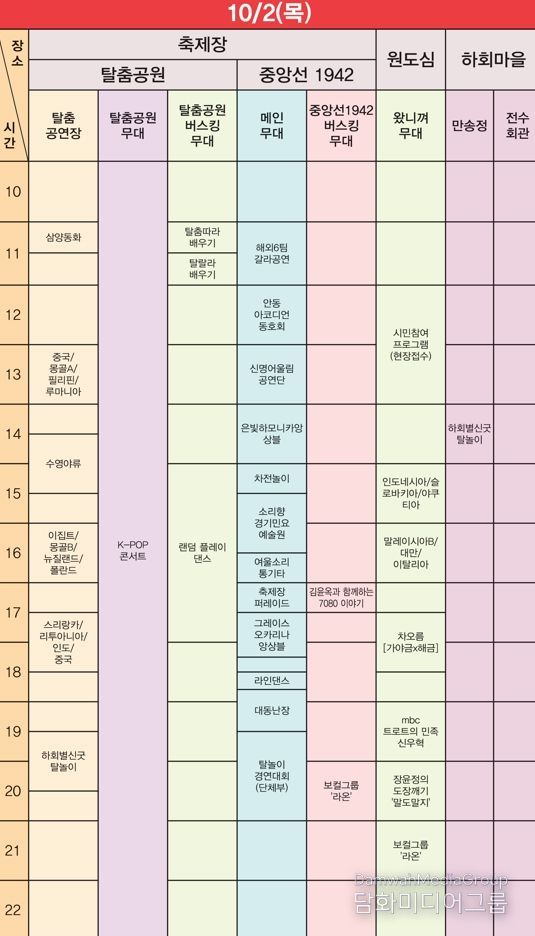 안동시는 “일곱째 날은 전통 탈춤, 해외공연, 그리고 K-POP 무대가 함께 어우러져 남녀노소 누구나 즐길 수 있는 다채로운 날”이라며, “특히 한류관광페스타는 국내외 관광객을 아우르는 대표 프로그램이 될 것”이라고 밝혔다.