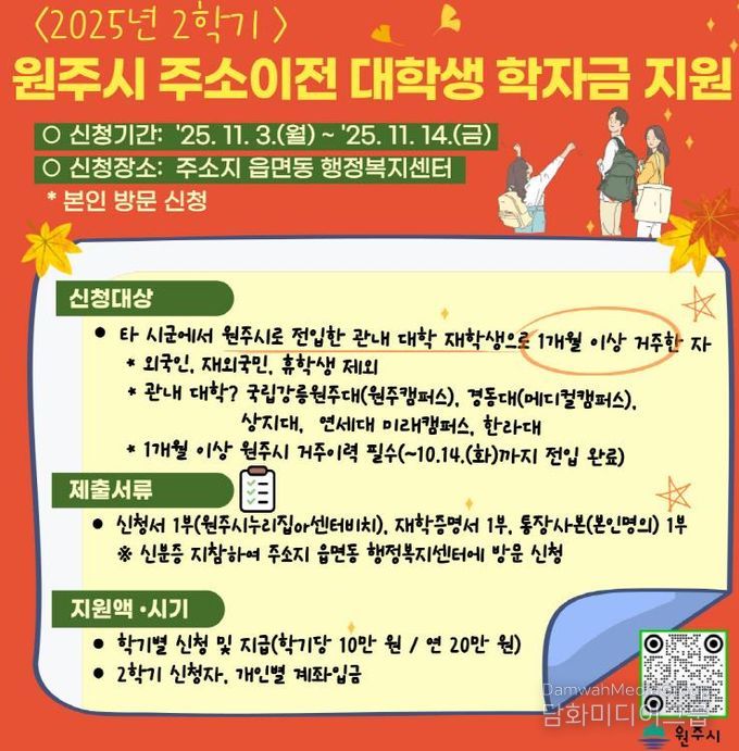 시민행정신문 강갑수 기자 | 원주시는 전입신고를 마치고 원주시민이 된 관내 대학생에게 상·하반기 각 10만 원씩 연 20만 원의 학자금을 지원하고 있다.