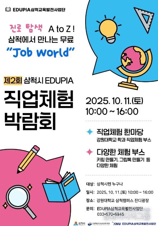 시민행정신문 강갑수 기자 | 삼척시와 EDUPIA삼척교육발전사업단은 오는 10월 11일 오전 10시 강원대학교 삼척캠퍼스 잔디광장에서 ‘제2회 삼척시 EDUPIA 직업체험 박람회’를 개최한다고 밝혔다.