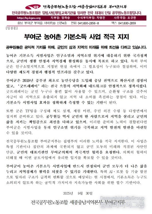 시민행정신문 강갑수 기자 | 전국공무원노동조합 부여군지부는 지난 9월 30일 의견문을 통해, 부여군이 추진 중인 농어촌 기본소득 시범 사업을 적극적으로 지지하며, 군민과 함께 공모사업 유치에 최선을 다하겠다는 뜻을 밝혔다.