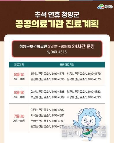 시민행정신문 기자 | 청양군보건의료원은 추석 명절 연휴인 3일부터 9일까지 7일간 응급 및 일반 환자의 진료 공백을 최소화하기 위해 응급진료 상황실을 운영한다고 밝혔다.