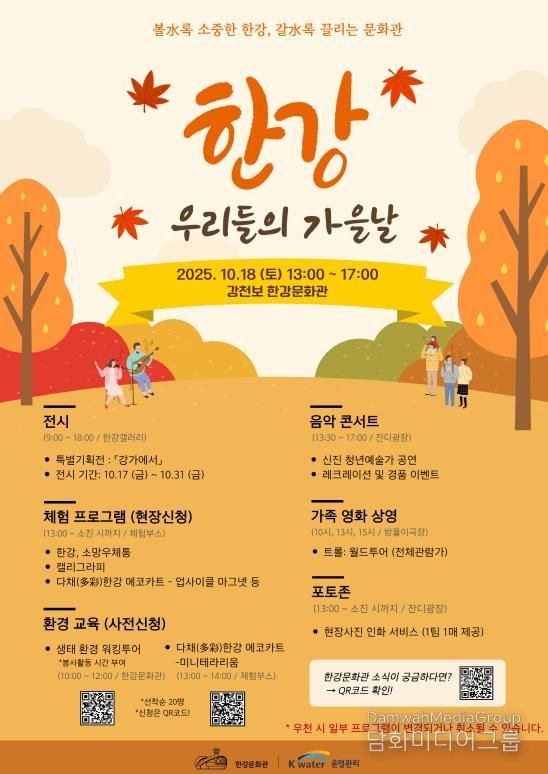 시민행정신문 강갑수 기자 | K-water한강보관리단과 케이워터운영관리 한강문화관은 오는 10월 18일 가족과 이웃이 함께 즐기는 대표 문화축제 “한강, 우리들의 가을날”를 개최한다고 밝혔다