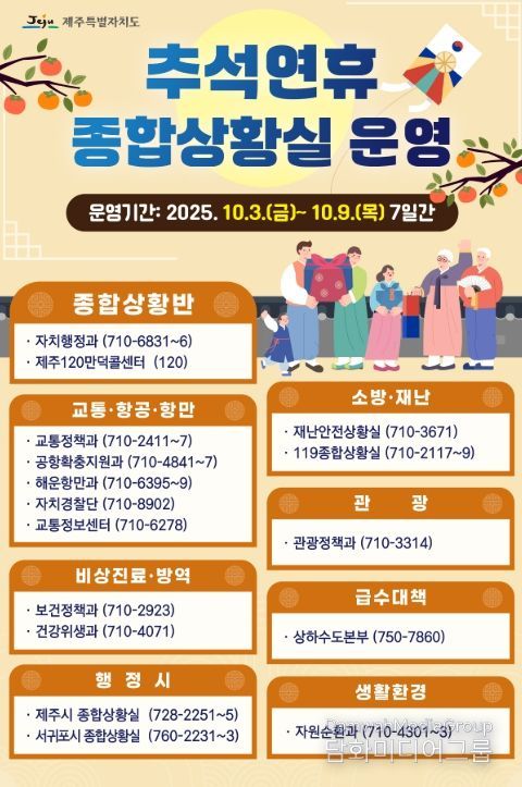 추석 연휴 중 불편사항이나 비상상황 발생 시 도청 종합상황실 또는 제주 만덕콜센터로 연락하면 된다.