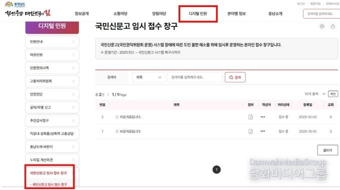시민행정신문 강갑수 기자 | 충남도는 2일부터 도 누리집에 ‘국민신문고 온라인 임시 접수 창구’를 개설·운영하고 있다고 밝혔다.