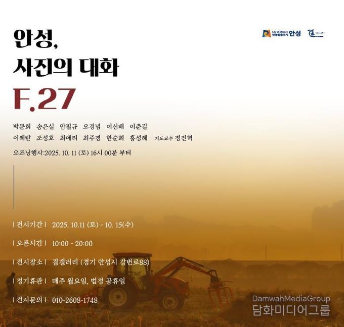 시민행정신문 기자 | 안성시 사진동아리 F.27 photo가 오는 10월 11일부터 15일까지 안성천 작은미술관 결갤러리에서 전시회 ‘안성, 사진의 대화 F.27’을 개최한다. 이번 전시는 동아리 회원 18명이 참여해 안성의 자연환경과 사람들의 이야기를 기록한 작품을 선보인다.
