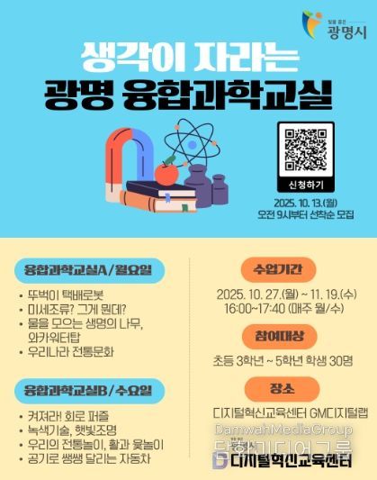 시민행정신문 강갑수 기자 | 광명시는 오는 10월 27일부터 11월 19일까지 초등학교 3~5학년을 대상으로 ‘생각이 자라는 광명 융합과학교실’ 시범수업을 운영한다.