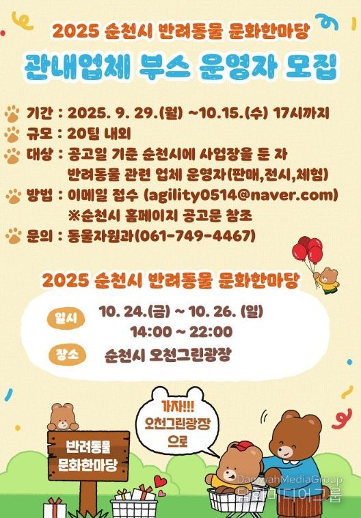 시민행정신문 강갑수 기자 | 순천시가 오는 24일부터 26일까지 3일간 오천그린광장에서 열리는 반려동물 문화한마당의 성공개최를 위해 관내 업체가 참여하는 부스 운영자를 공개 모집한다.