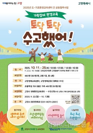 시민행정신문 강갑수 기자 | 고양특례시는 가족과 함께 참여하는 환경교육 프로그램‘토닥 토닥 수고했어!’를 오는 11일부터 25일까지 매주 토요일 고양생태교육센터와 고양생태공원에서 운영한다고 밝혔다.
