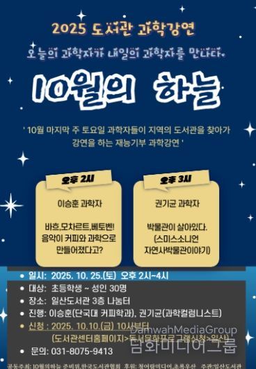시민행정신문 기자 | 고양특례시 일산도서관에서는 과학자들의 재능기부 도서관 과학 강연프로그램 ‘10월의 하늘’을 운영한다.