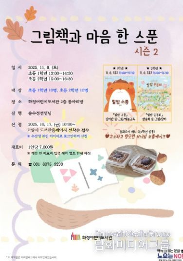 시민행정신문 기자 | 고양특례시 화정어린이도서관은 오는 11월 8일 ‘고소하고 향긋한 보늬밤 보틀케이크’를 만들어보는 그림책 동화요리 프로그램‘그림책과 마음 한 스푼-시즌2’를 운영한다.