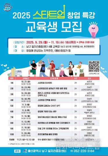 교육은 매주 2회 화, 목요일 14:00부터 16:00까지 울산 남구 일자리종합센터 4층 교육장에서 진행되며, 신청은 방문과 QR코드, 전화로 가능하다.