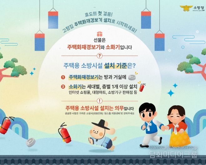 이 캠페인은 고향을 찾는 귀성객들이 부모님과 가족의 건강만큼이나 화재 안전에도 관심을 가져달라는 취지로 마련됐다. 소화기와 단독경보형 감지기만 설치해도 주택 화재 발생 시 신속히 대처할 수 있어 인명 피해를 크게 줄일 수 있다. 그래서 ‘안전은 최고의 선물’이라는 메시지와 함께 주택용 소방시설을 선물하는 문화를 권장하고 있다.