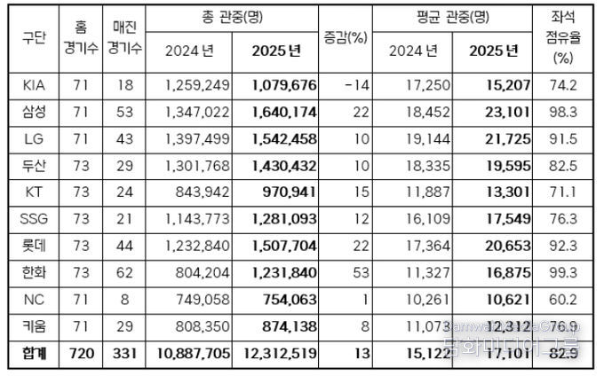 최종적으로 2025시즌은 지난 시즌 보다 약 13% 증가한 1,231만 2,519명의 관중이 입장하며 평균 관중 1만 7,101명을 기록했다. 전체 경기 수의 약 46%인 331경기가 매진됐고, 좌석 점유율 또한 82.9%를 기록했다.