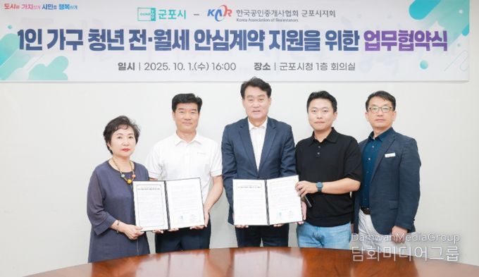 시민행정신문 이세훈 기자 | 군포시는 10월 1일 시청 1층 회의실에서 한국공인중개사협회 군포시지회와 청년 1인 가구 전월세 안심계약 지원을 위한 업무협약을 체결했다.