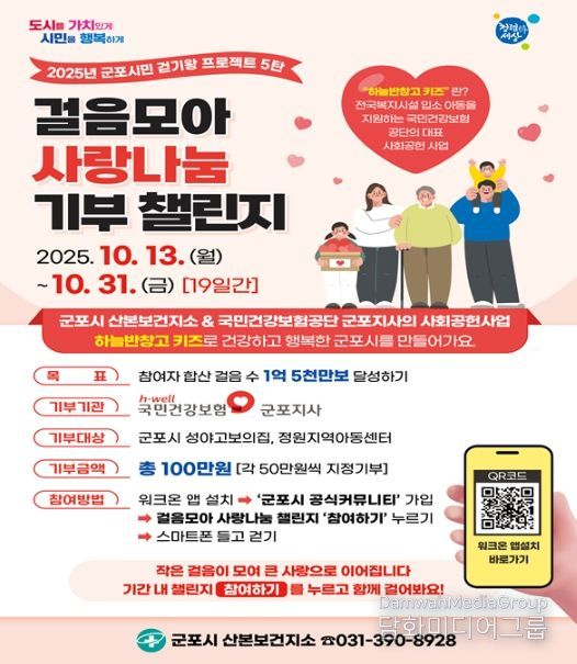 시민행정신문 기자 | 군포시 산본보건지소는 오는 10월 13일부터 31일까지(19일간) 국민건강보험공단 군포지사와 함께하는 '걸음모아 사랑나눔' 기부챌린지를 운영한다.
