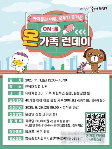 시민행정신문 강갑수 기자 | 대전 대덕구는 오는 11월 1일 한남대학교 일원에서 열리는 ‘온(ON·溫)가족 런데이’ 참가 가구를 선착순 모집한다고 9일 밝혔다.