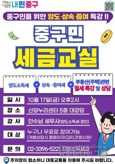 시민행정신문 강갑수 기자 | 서울 중구가 어렵게만 느껴지는 세금에 대한 이해를 돕기 위해 오는 17일 오후 2시 신당누리센터 5층 대강당에서 '중구민 세금교실' 특강을 연다.