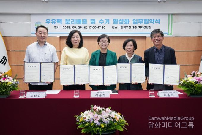 시민행정신문 강갑수 기자 | 서울 강북구는 9월 29일(월) 구청 기획상황실에서 강북구어린이집연합회와 어진이마을관리 사회적협동조합과 함께 우유팩 분리배출 및 수거 활성화 기반 구축을 위한 업무협약을 체결했다고 밝혔다.