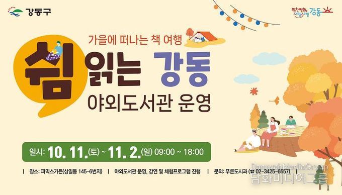 시민행정신문 강갑수 기자 | 강동구는 10월 11일부터 11월 2일까지 한 달간 파믹스가든(상일동 145-6)에서 주말 야외 도서관 '쉼 읽는 강동'을 운영한다고 밝혔다.