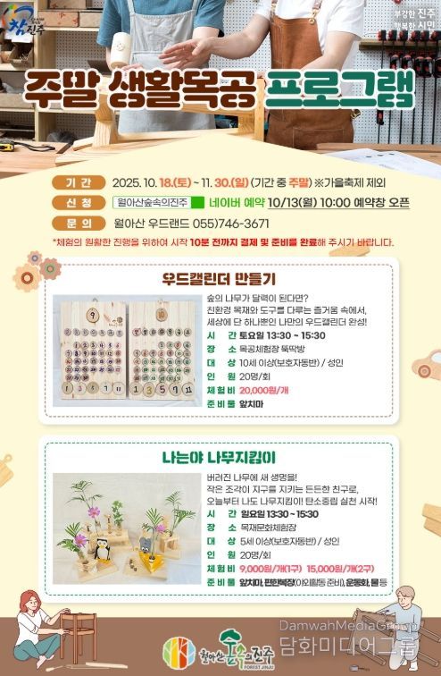시민행정신문 강갑수 기자 | 진주시는 오는 18일부터 ‘월아산 숲속의 진주’에서 시민들의 다양한 목공체험과 이를 실용적 생활목공의 경험으로 확대하기 위한 ‘주말 생활목공’ 프로그램을 운영한다고 밝혔다.