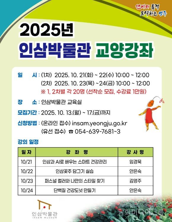 시민행정신문 강갑수 기자 | 영주시 인삼박물관은 2025 영주 풍기인삼축제와 연계해 오는 10월 21일부터 24일까지 시민을 대상으로 생활 속 건강과 문화를 접목한 특별 교양강좌를 운영한다.