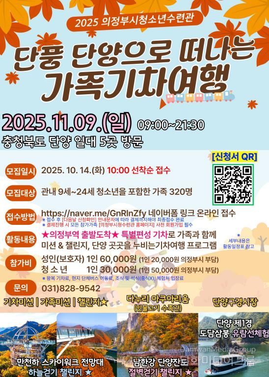 이번 행사는 단풍철 성수기를 맞아 의정부역에서 단양역까지 왕복 특별 기차편을 마련했으며, 도담삼봉·단양잔도·만천하 스카이워크 전망대·다누리 아쿠아리움·구경시장 등 단양의 대표 명소를 탐방한다. 참가 가족은 두 팀으로 나뉘어 순환형 일정으로 운영되며, 현장에서 미션 · 챌린지 활동이 함께 진행되어 여행의 재미를 더할 예정이다.