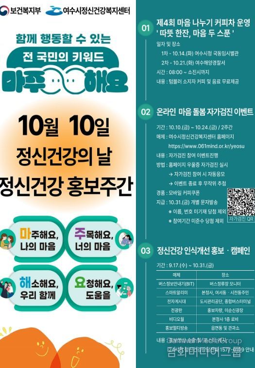시민행정신문 강갑수 기자 | 여수시는 정신건강의 날(10월 10일)을 기념해 10월 10일부터 24일까지 ‘2025년 정신건강 홍보주간’을 운영한다.