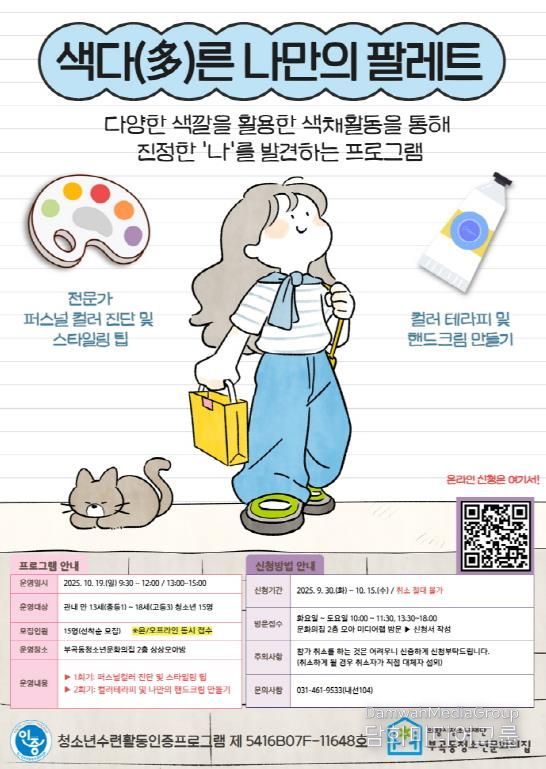 부곡동청소년문화의집 관계자는“이번 프로그램을 통해 청소년들은 다채로운 색채로 자신을 탐색하고 자존감을 높이는 의미 있는 시간을 갖게 될 것”이라며 “앞으로도 청소년 맞춤형 자기계발 프로그램을 적극 발굴하고 운영해 나가겠다”고 전했다.
