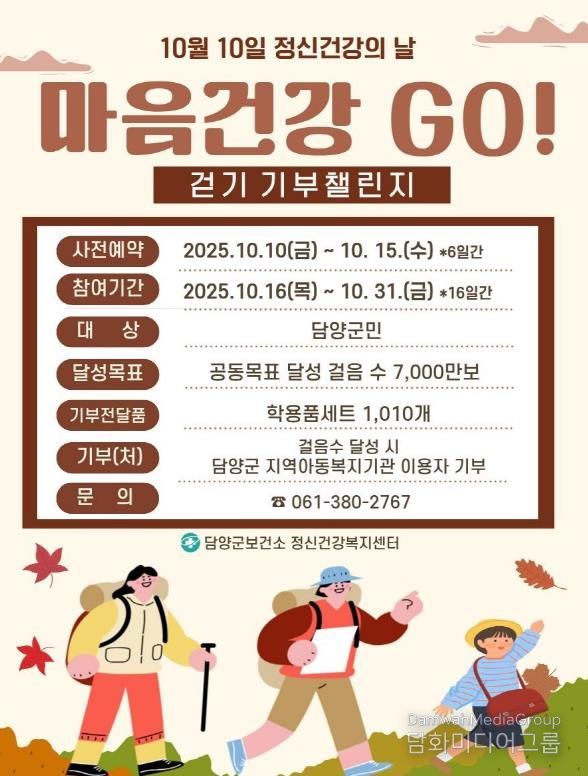 시민행정신문 강갑수 기자 | 담양군은 10월 10일 ‘세계 정신건강의 날’을 맞이하여 전 군민을 대상으로 걷기 기부 챌린지를 운영한다고 밝혔다.