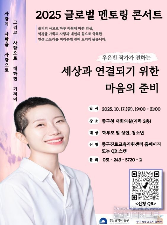 시민행정신문 강갑수 기자 | 부산 중구는 중구 진로교육지원센터 주관으로 오는 10월 17일 오후 7시, 중구청 지하2층 대회의실에서 '2025 글로벌 멘토링 콘서트'를 개최한다.