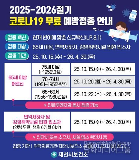 시민행정신문 기자 | 제천시는 오는 15일부터 65세 이상 어르신, 생후 6개월 이상 면역저하자, 감염취약시설 입원․입소자를 대상으로 신규 코로나 백신(LP.8.1)을 활용해 코로나19 무료 예방접종을 실시한다.