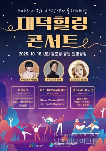 시민행정신문 기자 | 대덕문화관광재단은 오는 18일 동춘당 원형광장에서 ‘2025 대덕힐링콘서트’를 개최한다고 밝혔다.