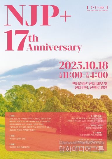 시민행정신문 기자 | 경기문화재단 백남준아트센터(NJP, 관장 박남희)는 2025년 10월 18일, 개관 17주년 기념 축제 'NJP+'를 연다. 특히 이번 행사는 백남준아트센터와 경기도박물관, 경기도어린이박물관으로 이어지는 산책로 환경개선과 맞물려 축하의 의미를 더하고 있다. 아트센터는 올해 시민 예술 교육프로그램인 ‘퍼블릭 아카데미’ 운영, 지역 연계 협력 축제인 ‘제8회 머내마을영화제’ 공동체 상영관 참여, 유휴부지에 공유 정원을 조성하는 ‘이키로(2km) 정원행동 캠페인’ 등 지역과 환경을 잇는 새로운 고객서비스 프로그램을 기획·추진하고 있다.