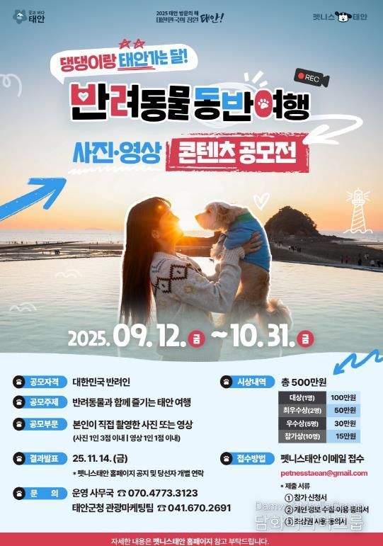태안군, "반려동물 동반 여행 콘텐츠 공모전 참여하세요!"
