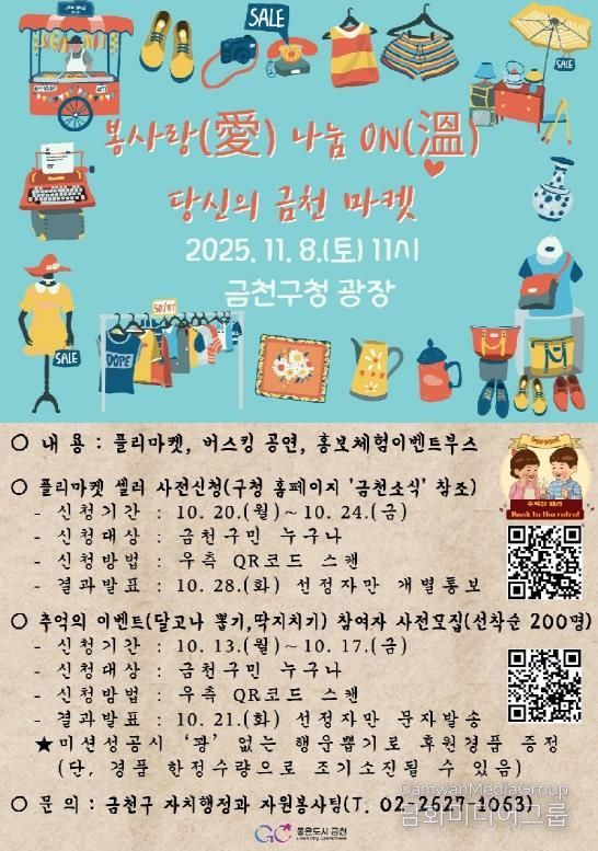 시민행정신문 이존영 기자 | 금천구는 오는 11월 8일 금천구청 광장 앞에서 ‘봉사랑(愛) 나눔ON(溫), 당신의 금천마켓’을 연다고 밝혔다.