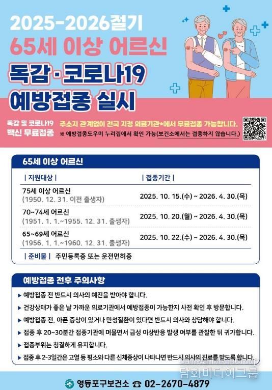 시민행정신문 강갑수 기자 | 영등포구가 겨울철 감염병 유행에 대비해 65세 이상 어르신을 대상으로 독감 및 코로나19의 동시 무료 예방접종을 권장한다고 밝혔다.